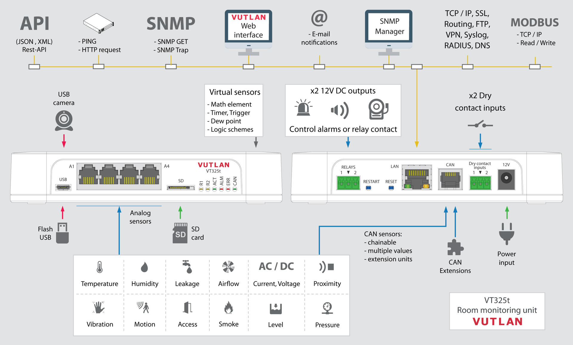 Mit dem Gerät lassen sich bis zu 100 Sensoren kontrollieren und bis zu 700 Elemente wie Trigger, Timer, Logikschemata, Benachrichtigungen oder potentialfreie Kontakte verwalten. VT225 verfügt über eine integrierte Web-Oberfläche zur einfachen Konfiguration und Zustandsanzeige.