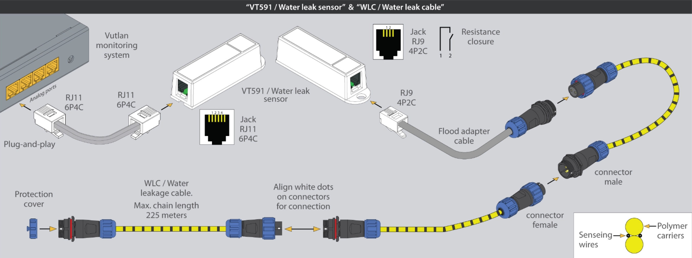 - Erforderlich: Betrieb nur in Verbindung mit einem Vutlan VT591 Wassermeldekabel-Sensor möglich