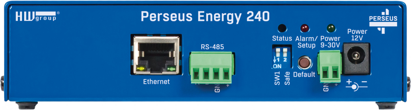 Perseus Energy 240 collects measured values from RS-485-based Modbus/RTU sensors and energy meters and makes them available in the LAN via standardised interfaces such as SNMP, Modbus/TCP, MQTT or XML. Up to 100 sensors or meters and up to 1,000 measured values (variables) can be managed centrally. Values from other HW‑group devices can also be integrated via the Meters Open API. Using conditions and actions, schedules, virtual sensors and optional Lua scripts, Perseus Energy 240 evaluates measured values, processes them and exports them as required.