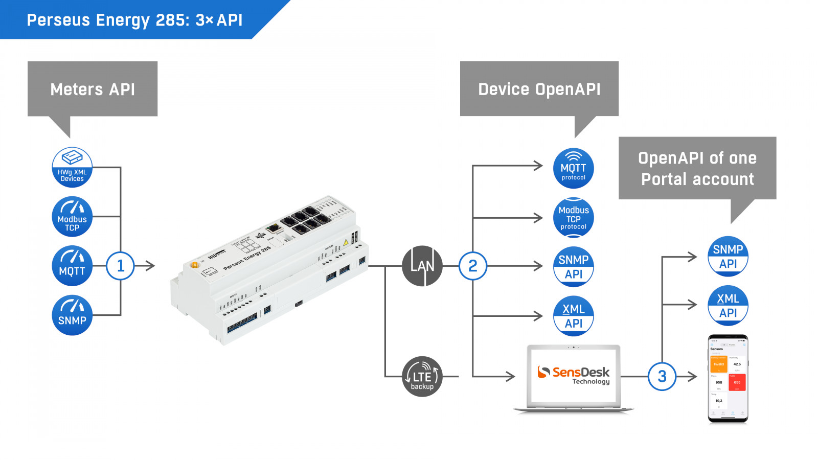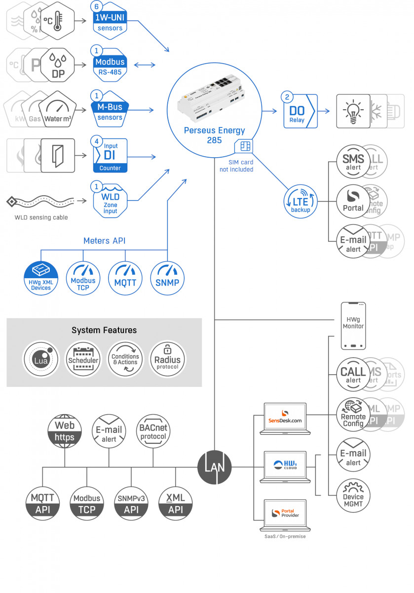 The integrated LTE modem ensures reliable data transmission. Alarms can be sent via email, SNMP trap, or directly via SMS or voice call. Measured values are available via open interfaces and APIs such as XML, Modbus/TCP, MQTT, or SNMP, and the Meters Open API also allows data from other HW group devices to be integrated.