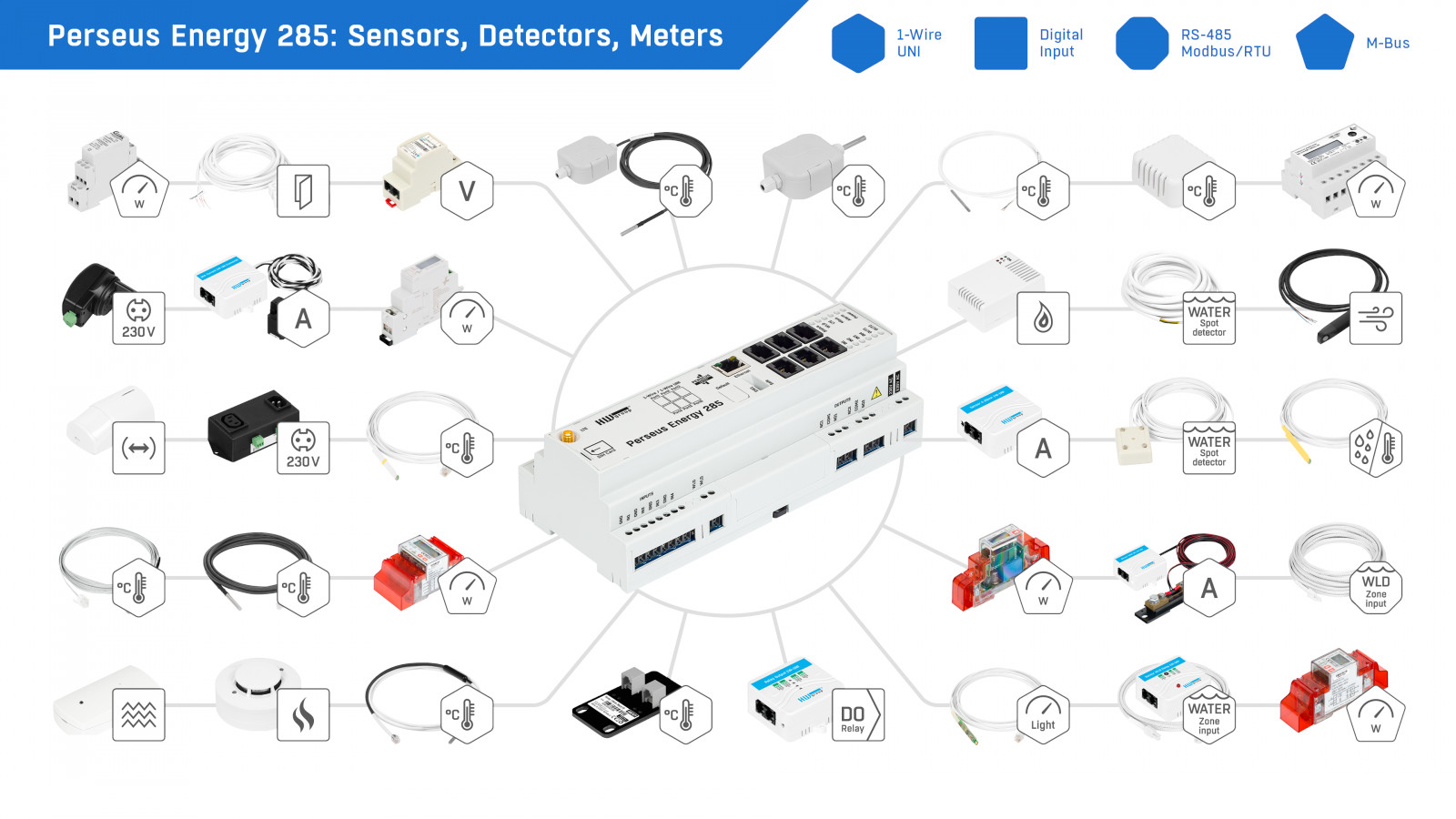 - Connection of 1-Wire UNI sensors and integration of RS-485/Modbus-compatible sensors and devices for versatile monitoring