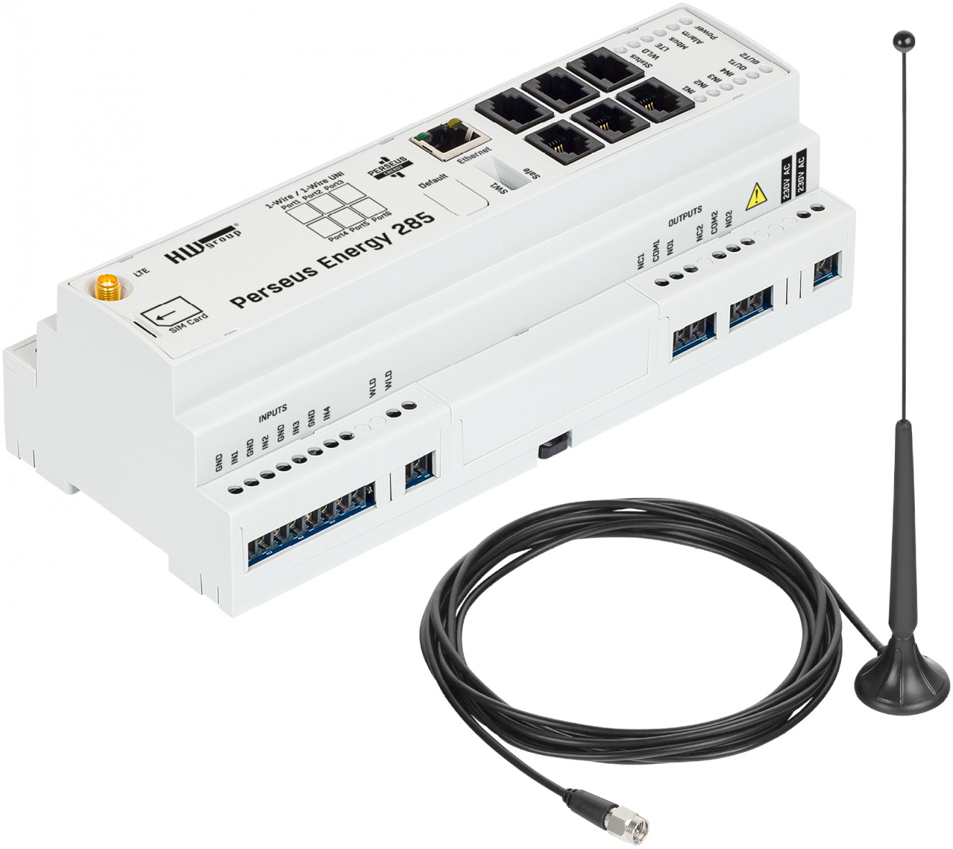 Compared to the Perseus Energy 242, the Perseus Energy 285 has expanded hardware connections: six 1-Wire UNI ports instead of four, four digital inputs instead of two, and two relay outputs instead of one.